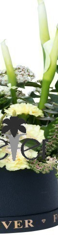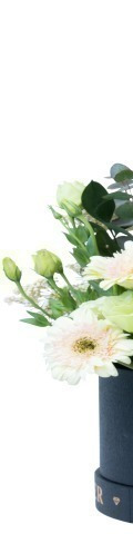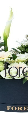 An exclusive flower arrangement for special occasions, the Eleganza White Flower Gift Box guarantees to delight the recipient. Beautifully presented in a gorgeous round black gift box embellished with the word "forever" and dazzling gold font, this exceptional floral gift includes 3 white gerberas, 4 calla lilies, 4 cream carnations, and a selection of seasonal blooms and foliage. Forever Presentation Box may be repalced with basket or vase if unavailable.